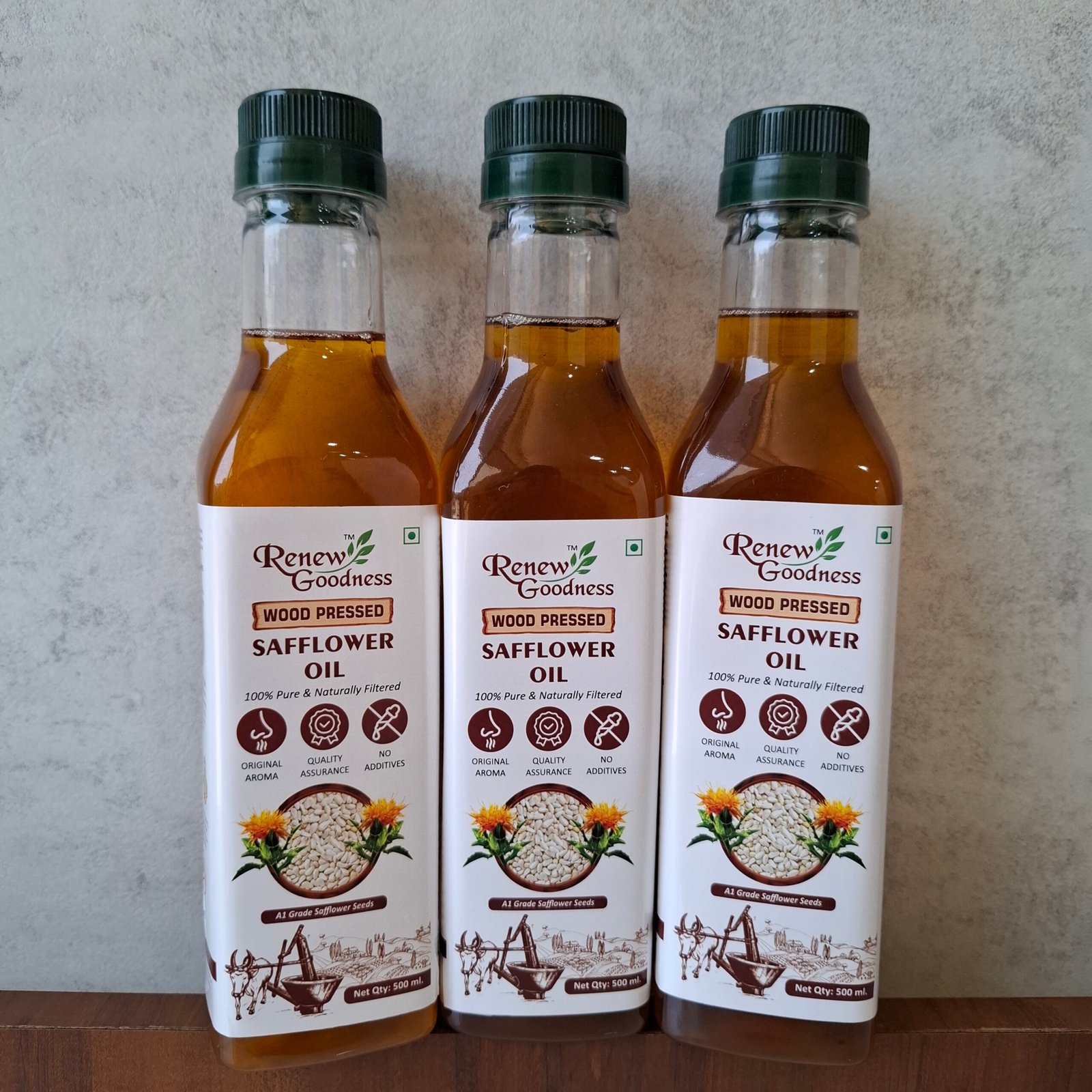 Our Wood-Pressed Safflower Oil is extracted from premium quality safflower seeds using the traditional wood-press (kolhu) method. This slow, low-temperature process helps retain its natural nutrients, light flavor, and health benefits.